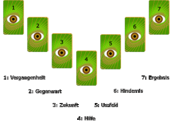 Diese Legeart ist recht gängig, um Antworten auf unterschiedliche Fragen zu erhalten. Nach dem Mischen und Abheben werden die Karten verdeckt wie in der Abbildung ausgelegt.