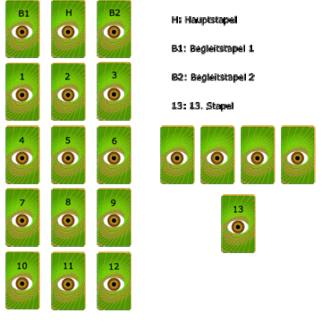 Bei dieser Legeart werden die Karten gemischt und in 13 Stapeln zu 6 Karten abgelegt. Aus diesen wählt man je nach dem gewünschten Thema den Hauptstapel und die 2 dazugehörigen Begleitstapel (siehe unten). Wie in der Abbildung legt man vom Hauptstapel und von den beiden Begleitstapeln jeweils vier Karten verdeckt untereinander aus (Positionen 1 – 4, 5 – 8 und 9 – 12). Die Karten des Begleitstapels 1 zeigen Einflüsse auf die Angelegenheit, jene des Begleitstapels 2 künftige Entwicklungen in der Angelegenheit auf. Wie in der Abbildung werden anschließend noch 4 Karten aus dem 13. Stapel verdeckt daneben gelegt. Sie zeigen auf, was in der Angelegenheit sicher nicht passieren wird. Zum Schluss werden die Karten von Position 1 bis Position 12 und dann die Karten aus dem 13. Stapel aufgedeckt und gedeutet.
